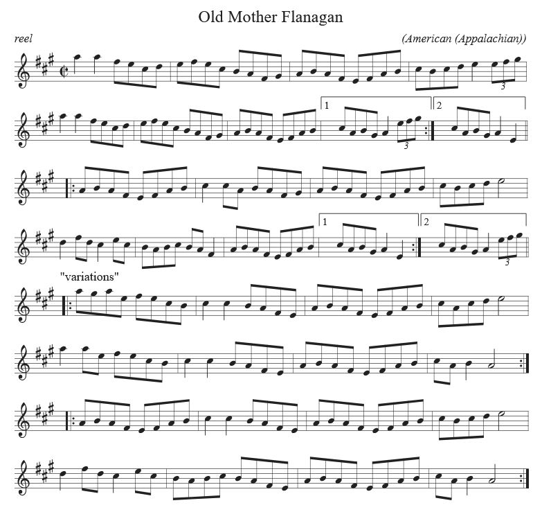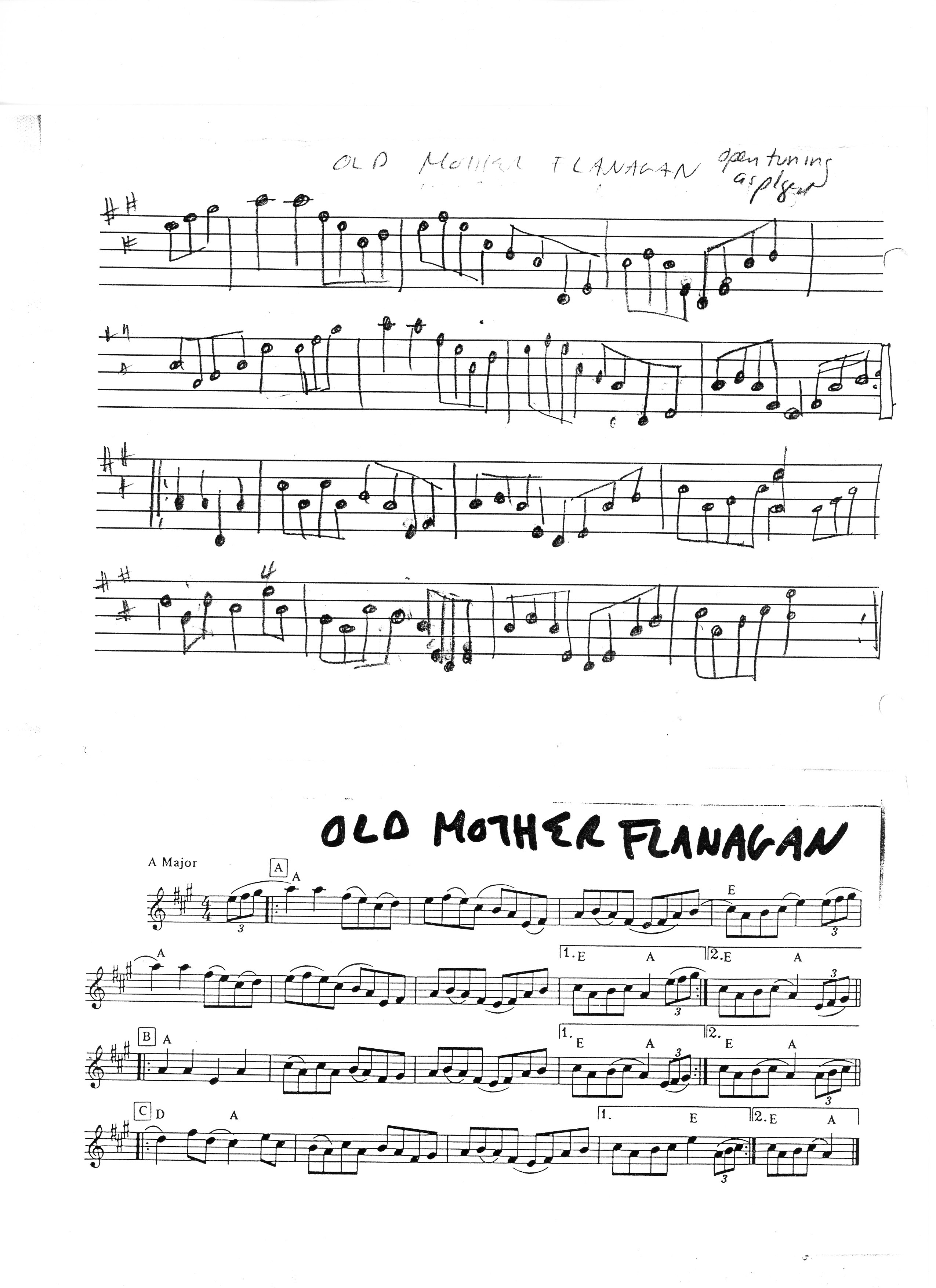 Old Mother Flanagan[Ozarks / Appalachian tune tune, G or A, goes with Liza Jane ][Possibly derived from Irish] Sometimes AEAE